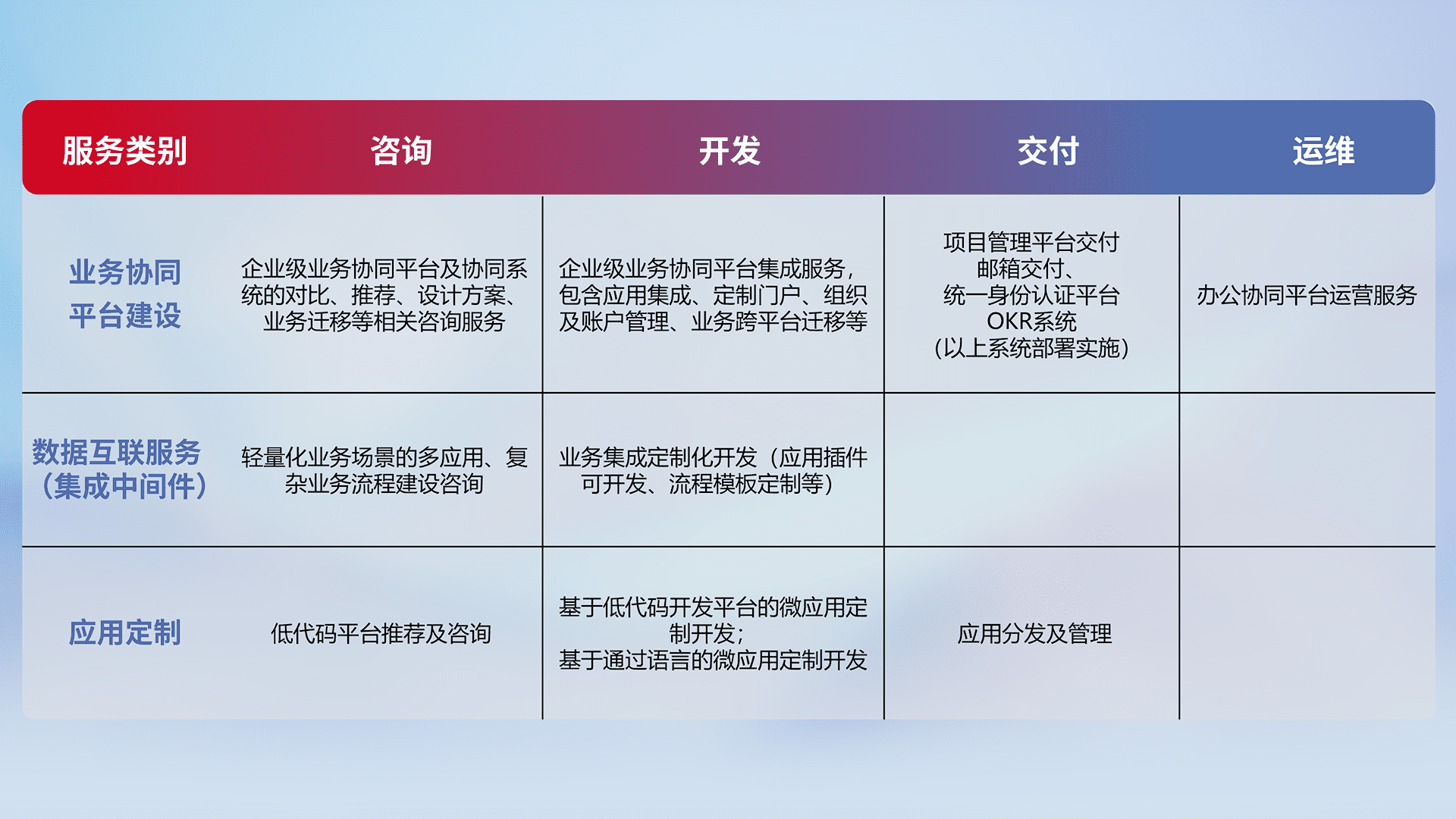 针对钉钉、、企微、、IDaas等平台级产品提供产品的规划、、、方案、、、交付、、、定制化开发等服务,,实现如统一协同办公、、、智能客户服务、、、、混合会议管理、、、、智能数据查询、、等业务场景,,,实现数字化转型。。